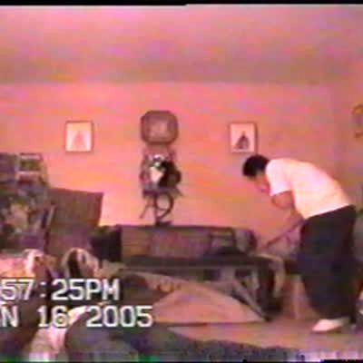 Kid demos karate moves with pillow, it lands & breaks something off camera. (very dark)