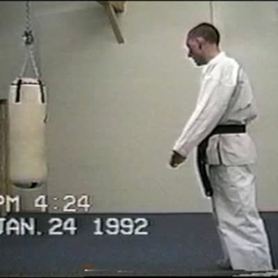 Karate Klutz. Boy bows 4 times then hurts hand while trying to break board.