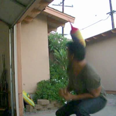 "Can't-Do-Karate Kid" A boy introduces himself outdoors as a very powerful kid before he karate-chops sticks between cinder-blocks but can't break them, then uses them as a bat against the cinder-blocks and breaks the cinder-blocks before he throws the sticks away.