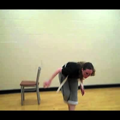 A teen girl is practicing karate kicks and accidentally kicks a chair at 0:23.