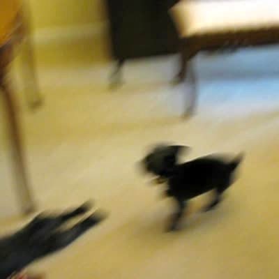 Black lab dog jumps up on piano, pounds keys and howls in living room.