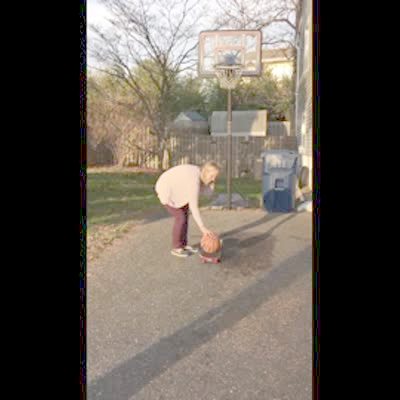 A woman tries to kick a basketball off of a skateboard and into a basketball hoop, but the ball hits her in the face outdoors.