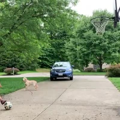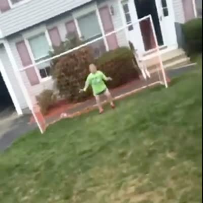 The camera holder kicks a ball that bounces off a house and hits a young girl in the back of the head.