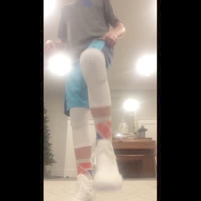 A teen girl attempts to show off the heels she wants to wear with her formal dress but she loses her balance as she tries to kick them up for the camera. She then says, "OK, maybe I'm not going to wear these."