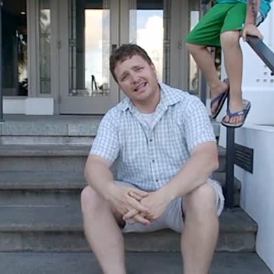 A man sits on the front steps to a building outdoors and recounts his first kiss with his wife while his son sits on the railing and kicks his dad until the boy accidentally falls backward off the railing and into the bushes.