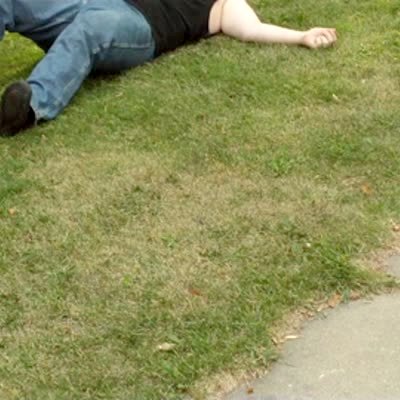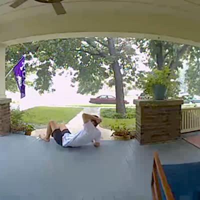 "Bested by a Bug" A man tries to kick a bug off of a patio porch and he slips and falls. Home security footage.