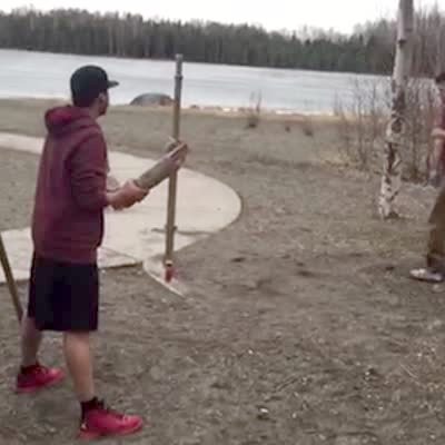 Teen boys make a war movie about destroying a snowman. Teen dressed as white ninja jumps off the deck and kicks large snowman's head off.