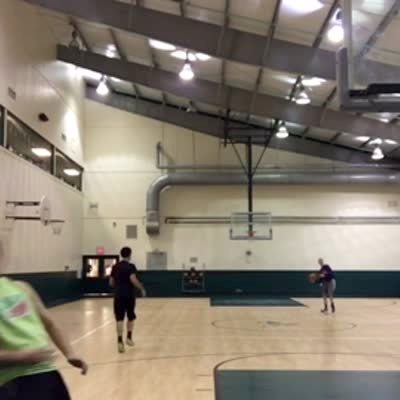 Five clips of a man doing basketball trick shots edited together. One from across a river, one from full court, one while he swings, one he kicks and the ball bounces off a building, and the last one he jumps against a chain link fence and shoots behind his back.