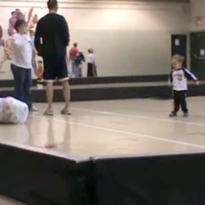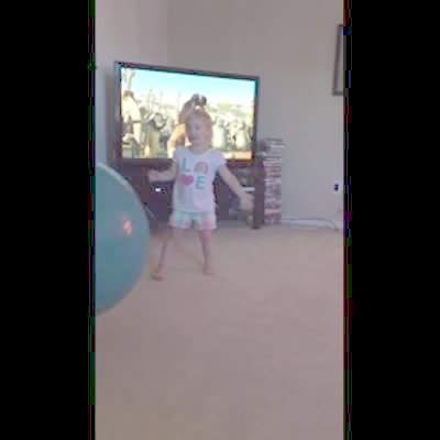 A tot girl says "kick it" repeatedly while she waits for an exercise ball. The ball comes from off camera, bounces off the wall behind the girl, and knocks her down when it hits her in the back of the head.
