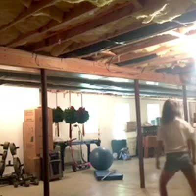 A teen girl kicks a yoga ball in a living room, and it bounces off of another teen girl's butt, then it hits the ceiling and she ducks while a light falls out of the ceiling and breaks. Slow motion.
