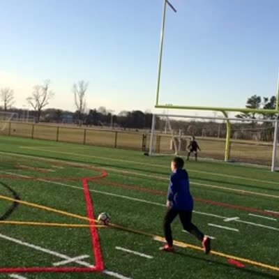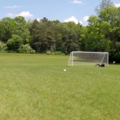 A boy kicks a soccer ball at a goal on a field and the ball bounces off the pole and hits the boy who plays goalie in the head. Featured talent cleared only (the two boys playing soccer).