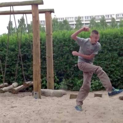 A teen boy tries to kick off the front of a Jeep to do a back flip, but he hits his head on the car.