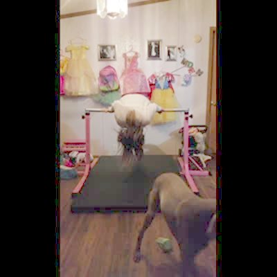 A woman kicks a princess dress off of a wall on to her face in the living room while she does a flip on a gymnastics bar.