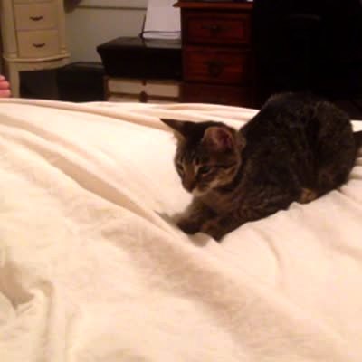 A grey and brown cat sits on a bed until her owner kicks up their foot from under the covers and the cat jumps straight up in the air, falling off the bed.