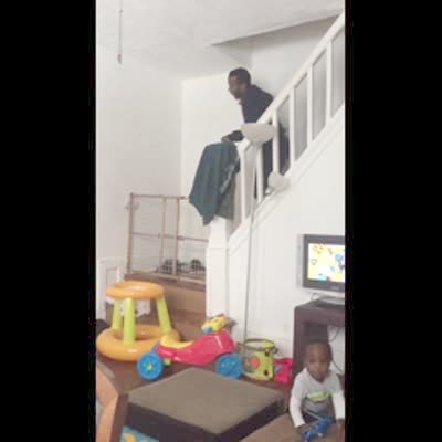 A man tries to kick off a wall at the bottom on a flight of stairs to climb over a baby gate. He falls to the ground.