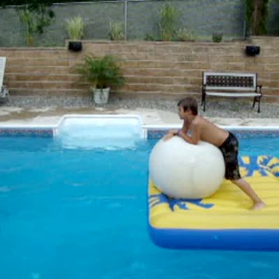 Boy stands on an inflatable raft in a swimming pool and leans on an exercise ball. Teen boy jumps off diving board and kicks the exercise ball out from under the boy, who is flipped up into the air, lands on the raft, and bounces into the pool.