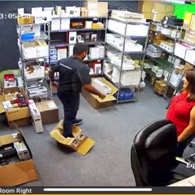 A man steps on a box and gets his foot stuck and he tries to kick it off but slips and falls in a storeroom. Security footage.