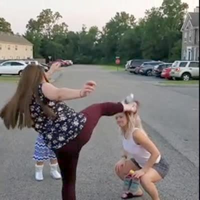 A woman kicks a woman in the side of the head while she kicks a water bottle off her head in the street.
