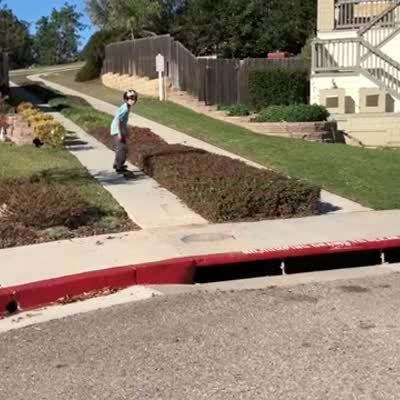 A young boy skateboards down a hill. He goes over a curb, steps off the board, and accidentally kicks it into a storm drain.