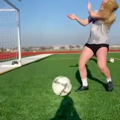 A teen girl kicks a soccer ball at a goal on a field, but it bounces off the goal and hits her in the face. Slow motion.