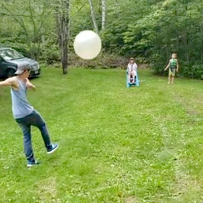A man tries to kick a soccer ball that is pitched to him like a kick ball in a yard. He slips on the ball and falls right on top of the ball, popping it. The camera jerks away and a girl cries off camera.