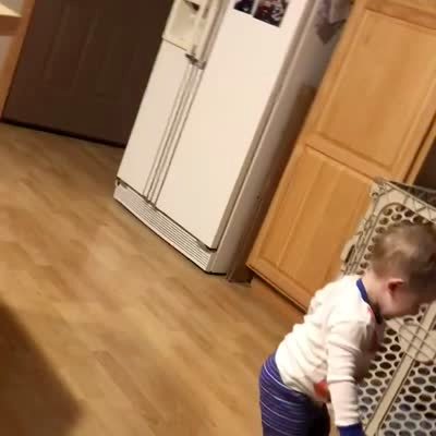 A tot boy wears adult slippers while he walks in the kitchen. He kicks up his foot and flings the slipper off and it hits the camera.
