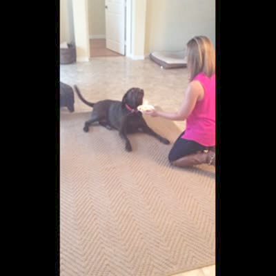 A woman sings "Happy Birthday" to a black dog indoors, holds a small cake with a candle in it up to the dog, and the dog knocks it out of her hand with its paw.