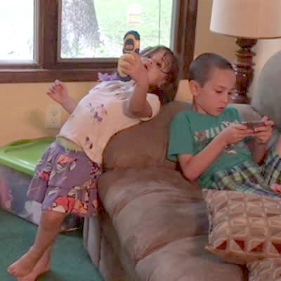 A teen girl jumps on an air mattress and launches a tot boy forward off of an air mattress. He hits a TV in cabinet, nearly knocking it over. The boy starts to cry and the teen girl ushers him out of the room. Two younger girls rush to return the room to normal.