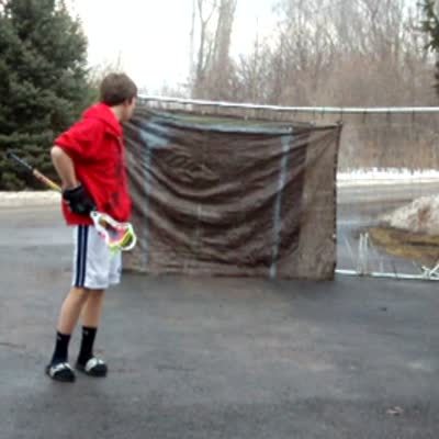 A teen boy tries to throw a lacrosse ball into a net but he misses and breaks a window in the background.