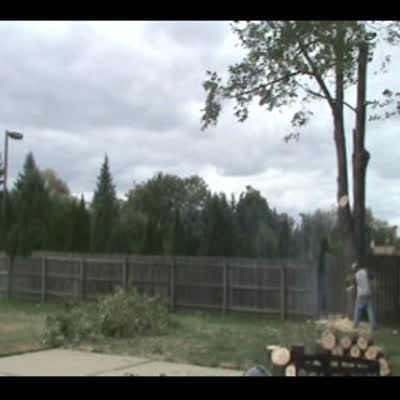 A man cuts a tree down with a chainsaw. It tips over, then a woman underneath it tries to stop it with a broom and it falls on her in a yard. Security camera footage. Featured talent cleared only (man with chainsaw and woman crushed by tree)