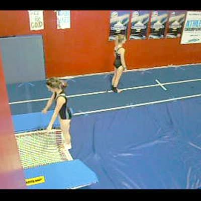 A teen girl in a leotard spins around the uneven bars in a gymnastics gym but loses her grip when she collides with a large pad and falls.