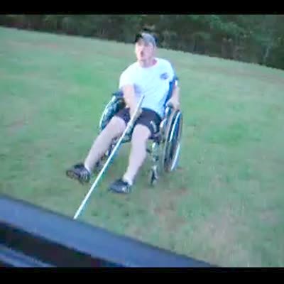 Man sits in a wheelchair gets pulled behind a car very fast. Man lets go of water skiing rope, rides across grass, hits a fence & flips out of chair. Far away & hard to see b/c car goes fast. With recovery. Family BBQ.