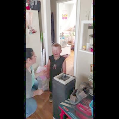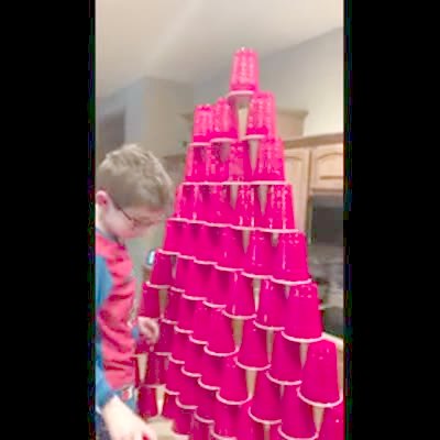 Two young boys build a tower of cups on a kitchen counter. At 2:50 one of the boys accidentally knocks them down. Instead of getting upset one of the boys says "Can we build it again?" and the other boy says "Let's do it!"