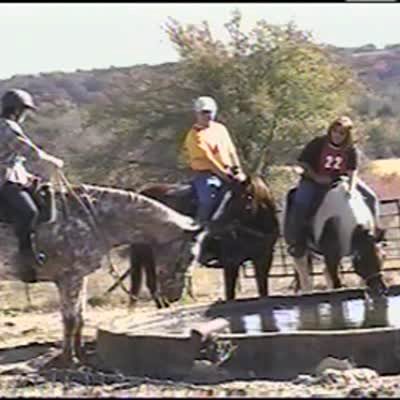 Teen girl lets her horse get a drink out of a trough. Horse decides to jump into the trough. Teen girl jumps off horse