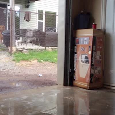 Two dogs stand outside and get excited when a man tells them to go out and lets them through a door that leads them back to where they were in garage.
