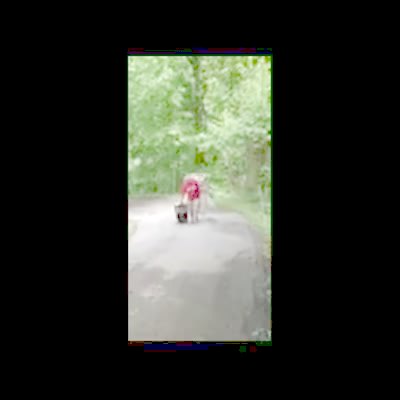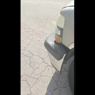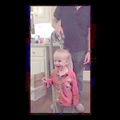 A young girl starts to drive her power wheels toy convertible car that she got as a Christmas present backwards down the sidewalk. Her grandma walks towards her and then the girl suddenly starts to drive forward and crashes into her grandma. The senior woman spreads her legs to let the car go under her, but then the girl hits her head on her grandma's groin and gets stuck there until the car tips back far enough for her to slide through.