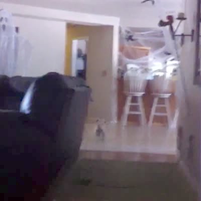 A cat sticks its claws into a man's sock in the living room and he drags it across the floor. It lets go and then chases him back and forth in the room. Eventually, it grabs onto his leg and digs its claws in and he gets hurt.
