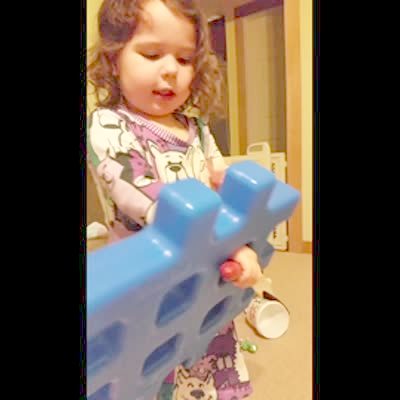 A tot girl says that her hand is stuck in a hole in a block toy, but she can't get her hand out because she is holding a toy in it. She lets go of the toy and is able to get her hand out.