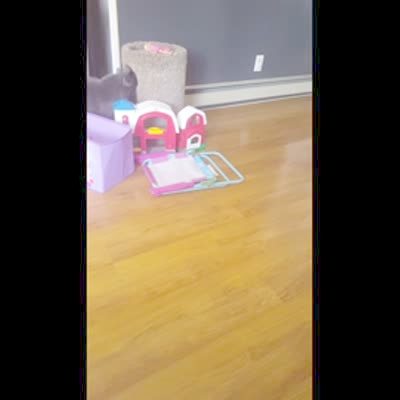 A large guinea pig struggles to get into a play house for guinea pigs when a girl lets him go.