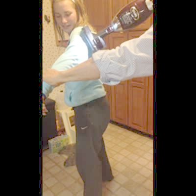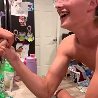 A teen boy and his off camera father test his strength in a kitchen. The boy makes a fist and the father pulls on his hand to try to get it to touch to the countertop, the boy pulls back but the dad lets go and he hits himself in the face.