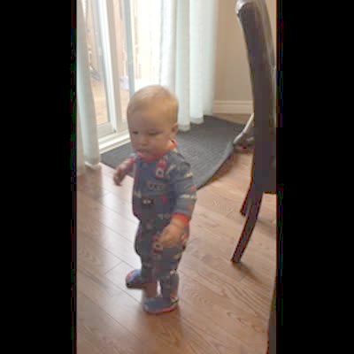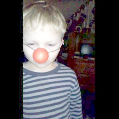 A tot boy wears a red Rudolph nose indoors and sings "Rudolph" to the camera when he pulls the nose off his face, then accidentally lets go and gets hit in the face with it.