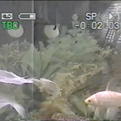 Small turtle in a big fish tank bites a fish's tail and doesn't let go. Turtle gets pulled throughout the aquarium.