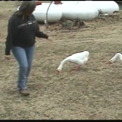 Woman gets chased by goose, it bites her butt & hangs onto her jeans while she runs around. Woman grabs goose's neck & holds it, goose still doesn't let go. Farm.