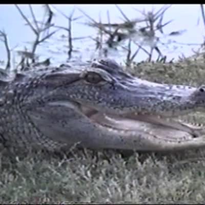 Men golfing on course. Alligator will not let one man get to his ball. They try to retrieve the ball with a long pole and only make the alligator more upset. It takes the ball in its mouth and returns to the pond.
