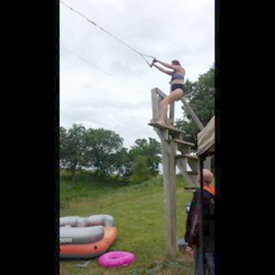 A young woman jumps off a platform with a rope swing into a pond outdoors but she lets go of the rope and falls on the ground before she can get to the water.