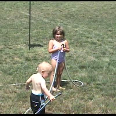 Tot boy holds the hose & doesn't know why the water stops. His sister holds the hose to trick him. Boy points hose at girl when she lets go & girl gets wet. Practical jokes backfires.