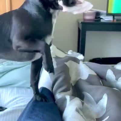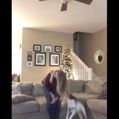 A man tosses a toy up and catches it in front of a dog. The dog gets off the couch, and the man tosses it once more. The dog thrusts both of its paws into the man's groin. The man falls down and lets go of the toy, which the dog takes.