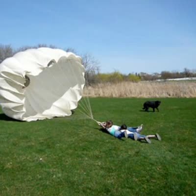 Three girls lie on a grassy field holding onto a big white parachute in the wind and getting dragged a little bit. Two of the girls let go and the third girl gets pulled around the field by a large gust of wind.