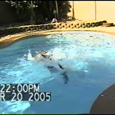 2 big dogs are playing in swimming pool. Black dog steals chew toy from brown dog in the water, brown dog bites black dog's tail as he swims away and tries to get out of the pool. Brown dog won't let go.