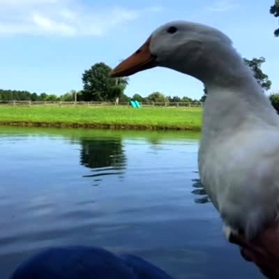 A man paddles in a paddle boat on a pond while holding a duck. He sets the duck in the water. The duck does not want to be in the water and struggles to get free. As soon as the man lets go of the duck, the duck quickly flaps its wings to the shore.